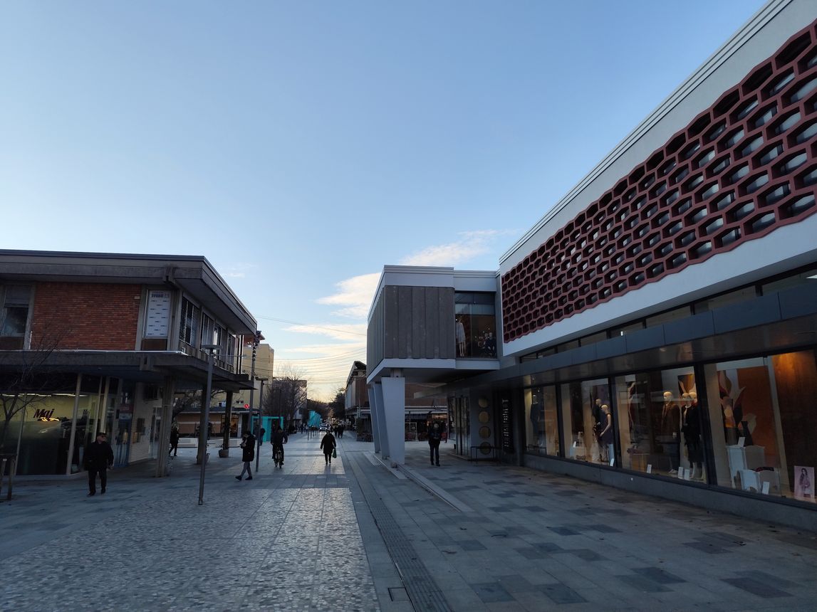 Na drugi strani sprehajališča je bila nekoč ulica in parkirišče. Ob njej je bil v začetku sedemdesetih zgrajen salon tovarne pohištva Meblo (Bevkov trg 6), kasneje pa še Kulturni dom Nova Gorica